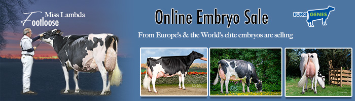6 maart 2026 Een gloednieuwe editie van de Eurogenes Online Embryo Sale is van start gegaan via de VEILING WEBSITE. Er is voor ieder wat wils met embryo's, zoals: vrouwelijke Blondin Detective (+16 Conf.) embryo's uit Kings-Ransom Park Darker VG-88-USA 2jr., zij is halfzus van Kings-Ransom Dropbox @ Semex, vrouwelijke Eskdale Mountie-Red embryo's uit Golden-Oaks Ambrosia-Red VG-89-NL EX-91 Uier 4jr., haar Ranger-Red dochter won afgelopen week het Middenklasse kampioenschap en Algemeen Kampioenschap Wintershow Noord-Holland 2026. Vrouwelijke Blondin Detective (+16 Conf.) embryo's uit Ms Lambda Fizz VG-86-USA 2jr., de Delta-Lambda dochter rechstreeks uit de Res. Grand Champion World Dairy Expo 2024 en meerdere 'herdbuilding' pakketten startend vanaf 75 EUR / embryo. Klik verder voor meer info. Lees meer