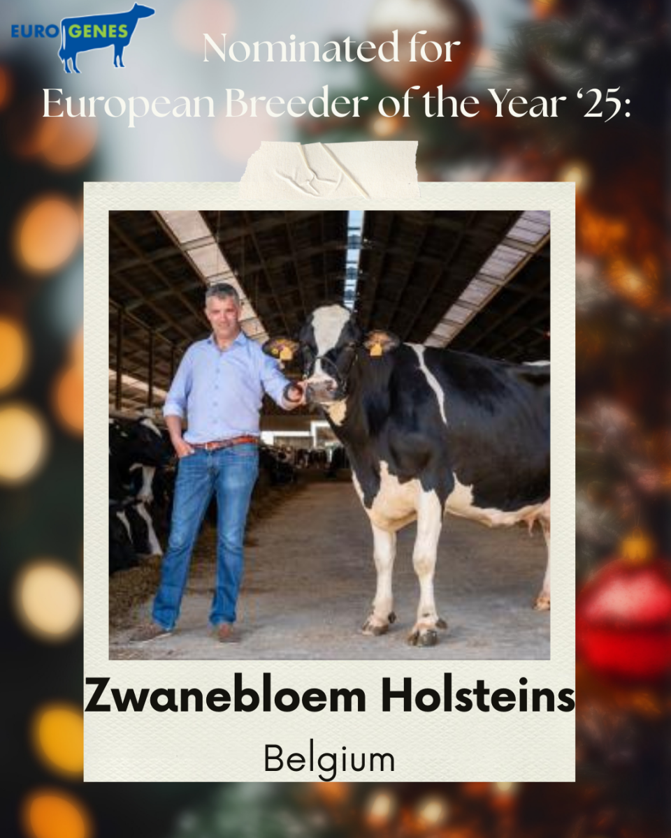 Zwanebloem Holsteins, owned by the Masscheleyn family, is an inspiring and modern dairy farm. The farm has approximately 900 cows in production and 700 youngstock. The farm has a biogas installation and supplies 1000 households with electricity. The farm focuses on high-quality cattle genetics. In October 2025, Zwanebloem Karl Coba 3718 made her debut in the top 50 female GTPI heifers with +3332 GTPI. She is from the well-known Meier-Madows El Jezebel EX-92 family. Another successful breeding product at Zwanebloem Holsteins is Zwanebloem Bourbon Ruslana VG-86, who is the grandmother of DGF Rollo @ AI-Total.