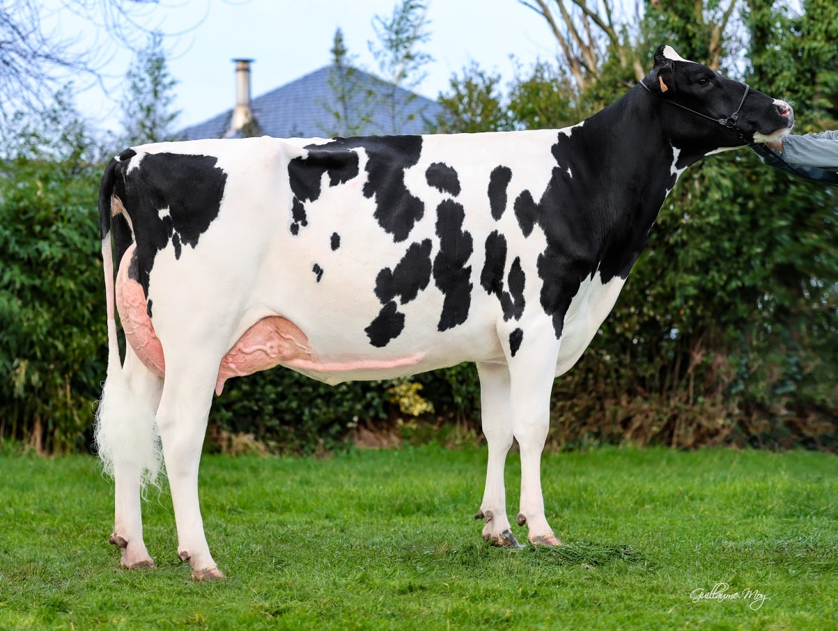 She belongs to one of the promising cows in Europe: Capj Teana *RC VG-86-FR 2yr. This Koepon OH Ryder daughter produced in her 1st lactation in 305 days 10.295kgM and traces back to the 2x French Cow of the Year: Amarante EX-FR. This family delivered many interesting and successful cows, with for example Carf Emeraude EX-91-NL, she was 2yr. old Champion National Show France, Le Mans (FR) & Noordeloos (NL), Intermediate Champion Marienwaerdt 2013 and Dutch Cow of the Year 2022. This line of the Emeraudes delivered also JK DG Esmeralda EX-92-NL EX-94-MS (Res. Champion 2yr. Old National HHH Show '16, Champion 2yr. Old Dairy Fair Mariënwaerdt '16 & Res. Champion 2yr. Old Hoornaar '16), JK DG Carmen 5 EX-92-NL EX-93-MS (Senior Champion, Udder Champion & Grand Champion Opmeer 2025, Intermediate Champion & Grand Champion Wintershow Middenmeer 2024, 1st, Best Udder and Reserve 2yr. old Champion National HHH-Show '22 and more).