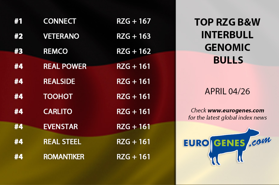 A great debut for Comet son Connect this run in Germany! He came in as the Nr.1 B&W RZG Genomic sire at +167 RZG in combination with +150 RZM and +120 RZE (Type). In second follows the former Nr. 1 B&W RZG genomic sire, Veterano at +163 RZG. The stage is complete with Real Syn son, Remco at +162 RZG. DG Der Tank is debuting at the 22th spot in this ranking with +158 RZG! He is a Real Syn son out of Beerzedal HiPo Pfct Emma VG-85-DE 2yr., bred by Diamond Genetics and will be soon available through the AI-Total portfolio. Pikachu son Picard is charttopper in the B&W RZG daughterproven ranking this run at +148 RZG. He is bred in Luxembourg and goes back on the Veneriete Ida cow family! With 2371 daughters at 754 farms and +144 RZG came AltaZarek son Zivet at the 2nd spot.