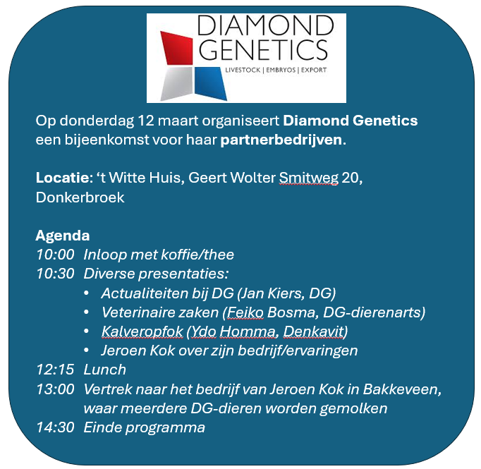 Wil je meer weten of vrijblijvend kennismaken? Meld je dan aan voor onze bijeenkomst op 12 maart in Donkerbroek via een email naar Jan Kiers j.kiers@diamond-genetics.nl